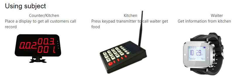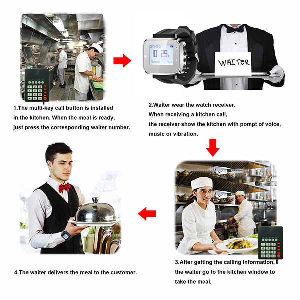 Kitchen calling system adopts wireless technology, connecting waiter and chef together. It is widely used in the kitchen for chef to reach out to serving staff when the food is ready. The kitchen calling system is a paging device, which allows you to easily call the server to send food out, thus creats a more inviting service atmosphere. This system helps you to be more productive by reducing mis-communication between kitchen and serving staff as well as preventing cold food serving. No need to yell out to create a pleasant environment, enhance restaurant image and improve your business.