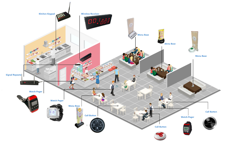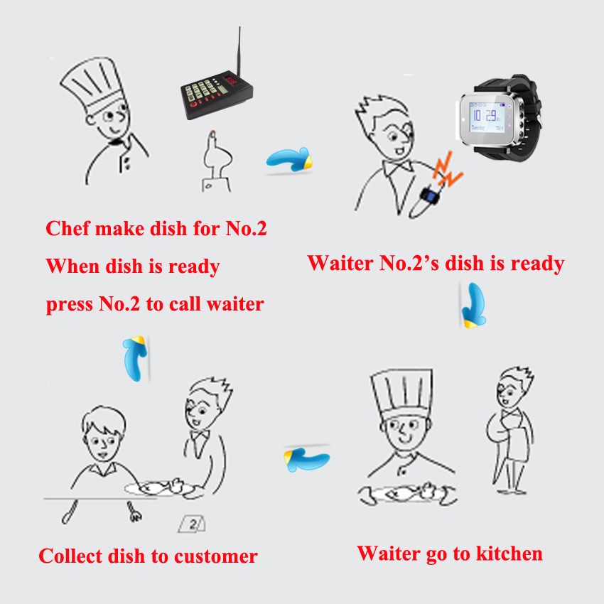 when food is ready,chief can use keypad to input the table number ,which will display on waiter's watch pager so that waiter will take food to the corresponding table.