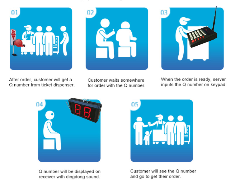2. Counter take orders then give customer a Q number from the ticket dispenser.