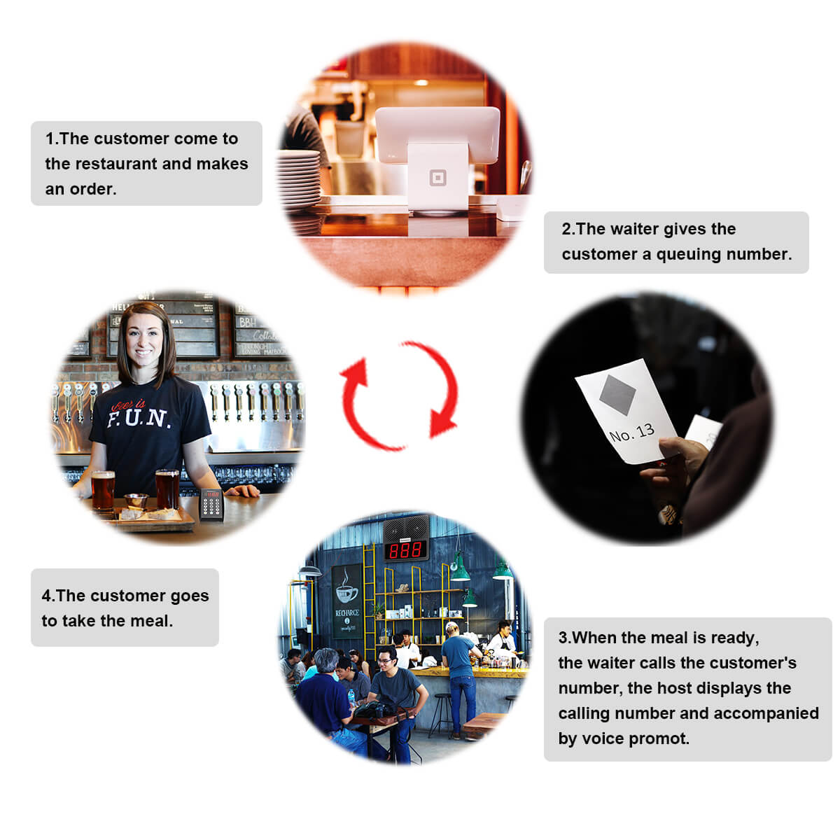 Queue calling system consists of the keyboard transmitter and the host receiver display. The food center hosts the keyboard to press the number to call customers to get their food. Once you press the number, the receiver, which is hanging on the wall, will broadcast the number by a voice prompt. Then customer will go to get the food and enjoy it.