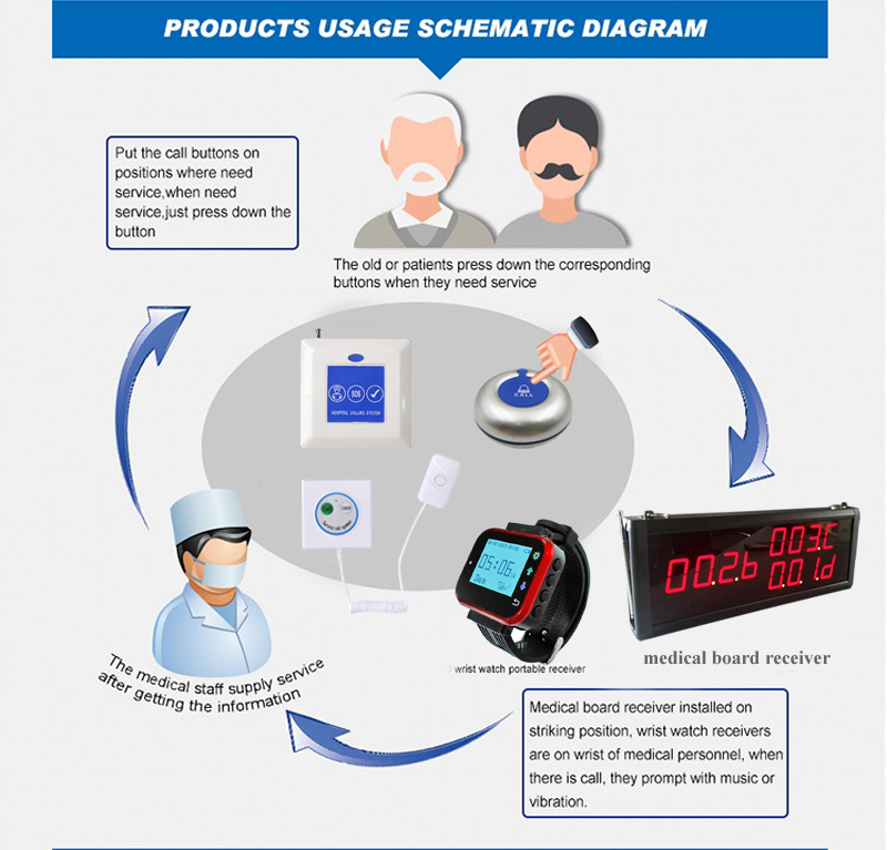 Call button installed beside the ward bed or in treatment room, can equipped with long hand shank,when patients have calling demands in wards or during the treatment, just press down the call buttons, medical staff can get the calling information through the medical board receiver with medical record slot, hang receiver in passageway by prompting with voice report,showing the number and so on, then they can go to the corresponding wards and treatment room to supply emergency treatment,the medical staff also can wear the protable receiver to to get the calling information from patients anywhere and anytime.